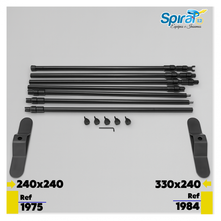 Su diseño modular permite ajustar el tamaño según la necesidad, con una medida máxima de 3,30 m de ancho × 2,40 m de alto y mínima de 1,50 × 1,40 m. Fabricado en tubos metálicos resistentes con bases de acero, garantiza estabilidad y durabilidad.
