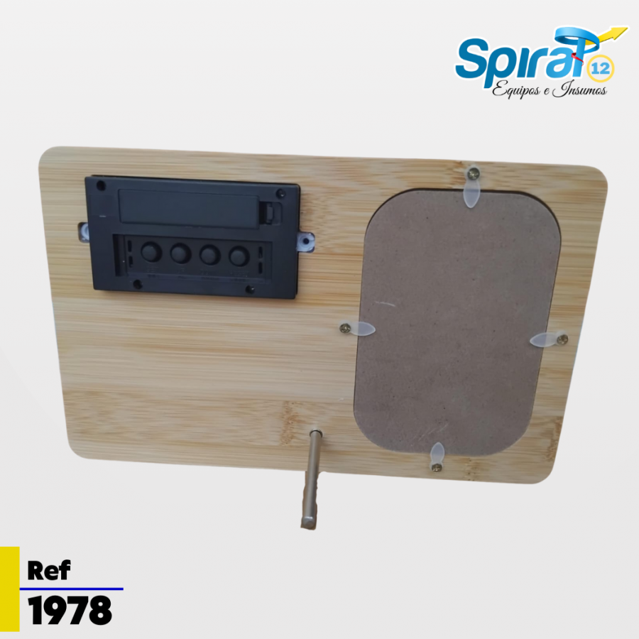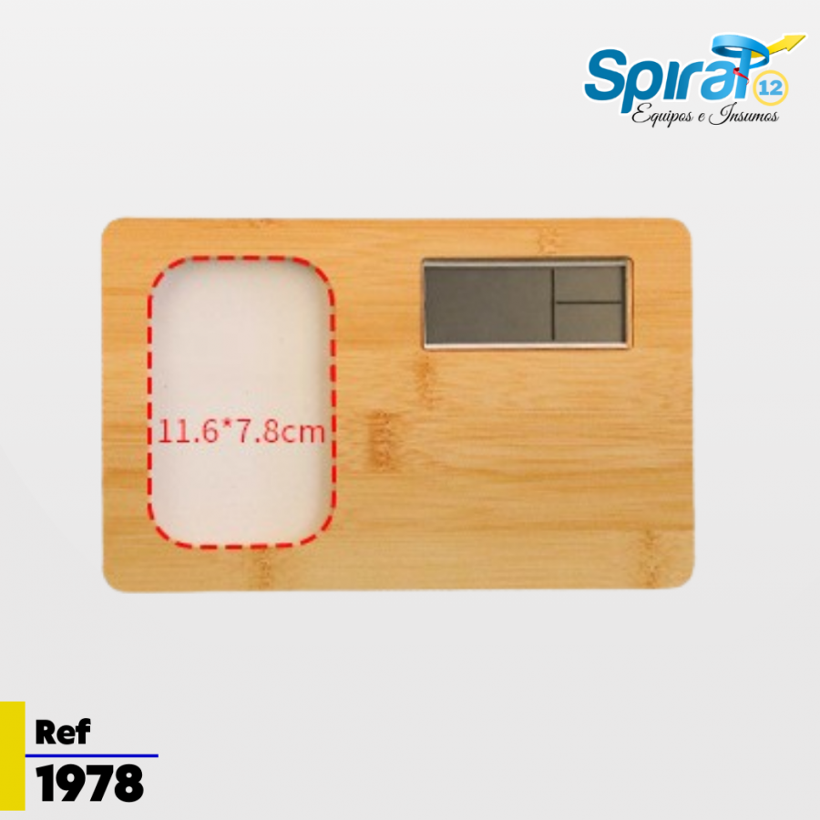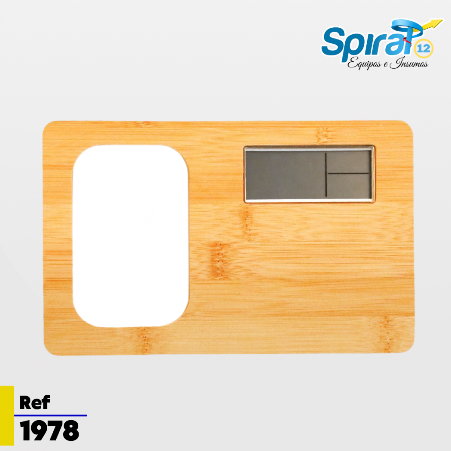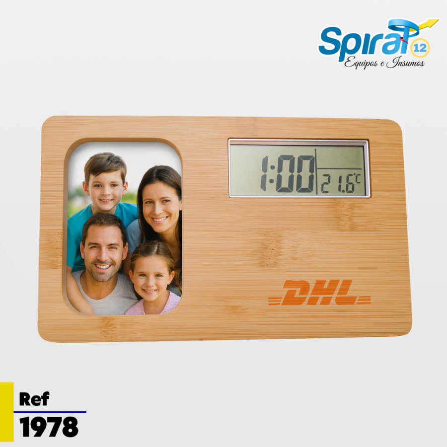 Fabricado en bambú natural con detalles en aluminio, incorpora un reloj digital con alarma y un marco personalizable mediante sublimación a todo color, perfecto para imprimir logotipos, mensajes o diseños exclusivos.